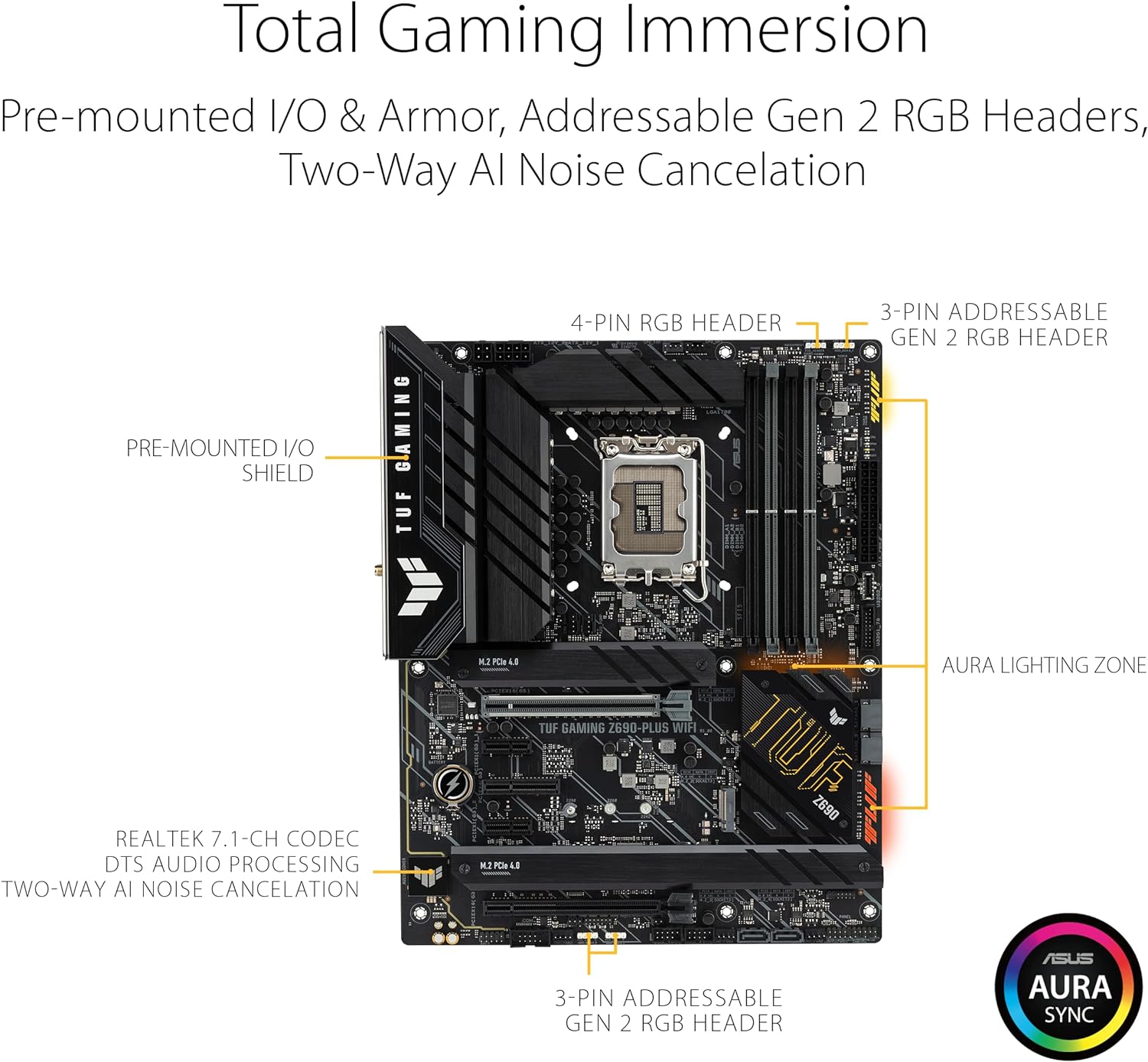 Fastest Connectivity: 4x M.2/NVMe SSD, Front panel USB 3.2 Gen 2 Type-C header, USB Gen 2x2 Type-C and Thunderbolt 4 header.PC DIY Friendly: SafeDIMM, PCIe 5.0 Safeslot, Q-LED, M.2 Q-Latch, Pre-mount I/O shield.New TUF Gaming Aesthetics: New ID design, Synchronizable LED effects across a vast portfolio of compatible PC gear, including addressable RGB strips with Aura Sync.Immersive Gaming Audio & AI Noise Cancellation: The Realtek S1200A codec offers pristine audio quality to draw you deeper into the game action or to enhance your favorite music tracks or videos. Communicate clearly with ASUS AI Noise Canceling Mic technology
